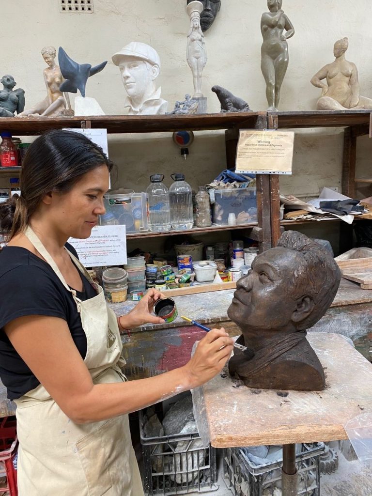I am currently finishing a small figurative sculpture of a reclining woman and also experimenting with patinas for my father’s bust.